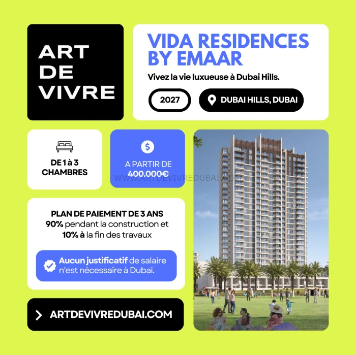Vida Dubai Hill est une promotion immobilière située à Dubai, dans le quartier de Dubai Hills. Face à l’un des plus grands parcs de Dubai, cette résidence de standing s’annonce comme l’une des plus belles et luxueuses du quartier. Proposée par Emaar, le promoteur numéro 1 à Dubai, Vida Dubai Hills possède de nombreux atouts. Art De Vivre vous propose l’analyse complète de la résidence, les prix des appartements, les photos du projet, le détail du plan de paiement et la brochure. Pour en savoir plus ou pour réserver un appartement au meilleur prix, n’hésitez-pas à nous contacter.